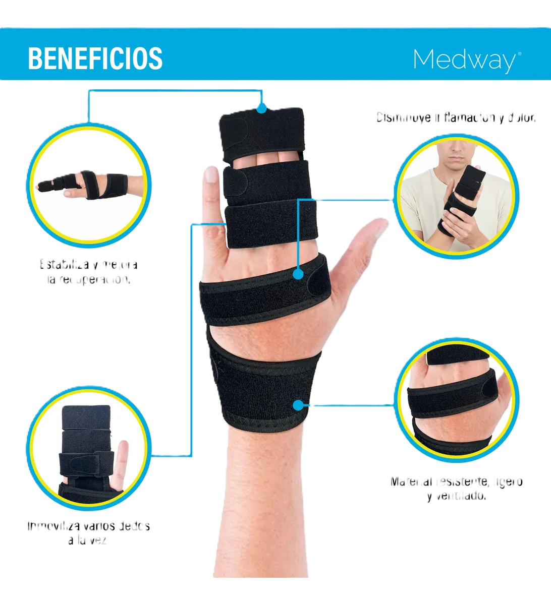 proporcionando una inmovilización superior que abarca de dos a tres dedos a la vez, excluyendo el pulgar. Ideal para casos donde se requiere un soporte más amplio en la mano.