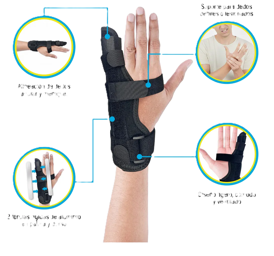 el quinto metacarpiano o la articulación del meñique tras golpes o esguinces. Su talla universal la hace apta para mano derecha o izquierda, sin complicaciones.